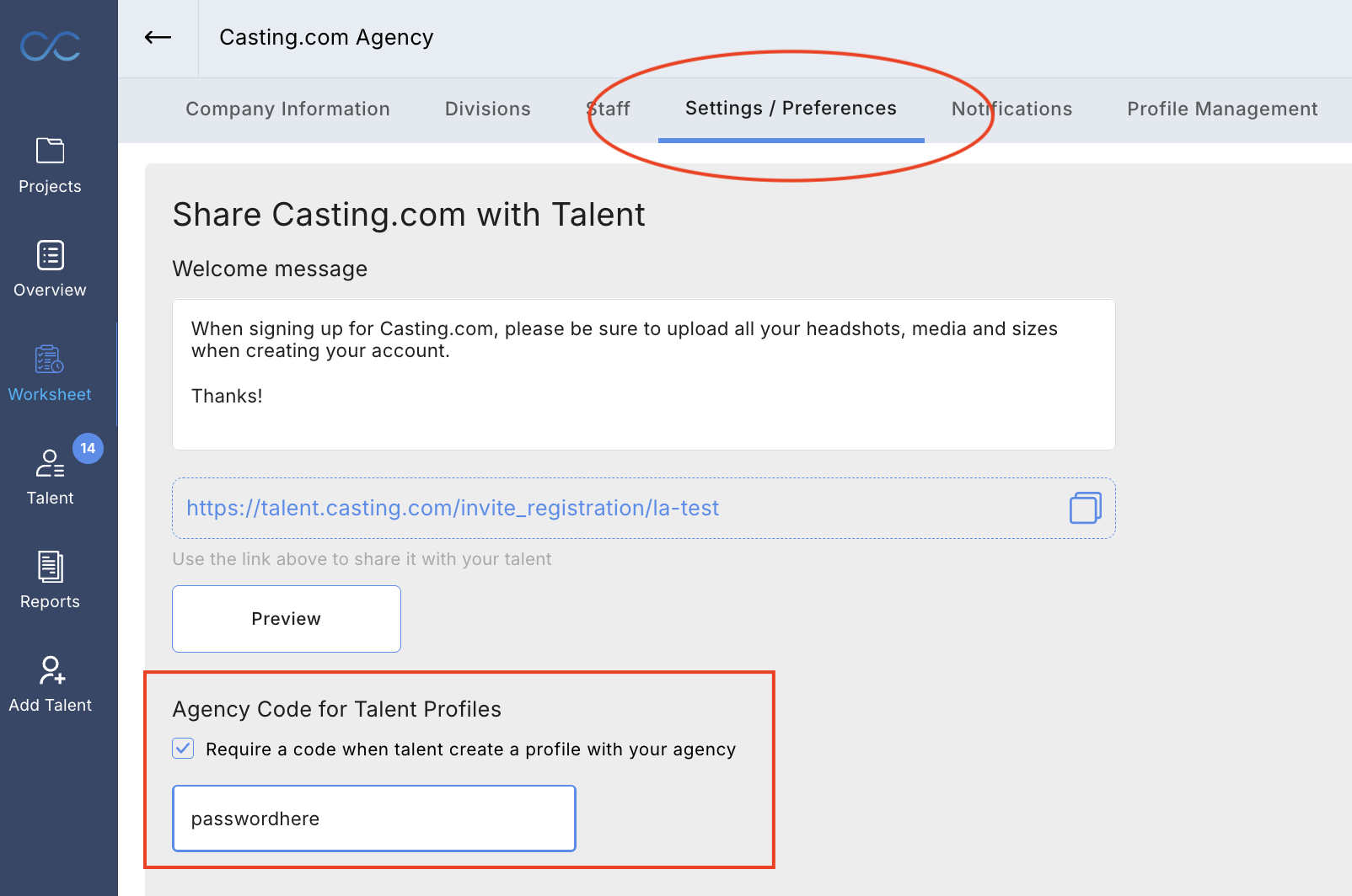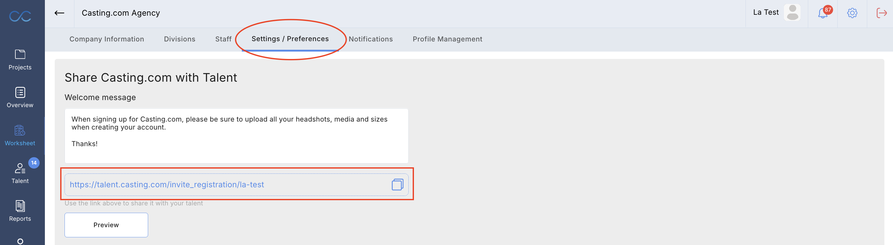 Talent won't need an agency link to sign up, they can do so at talent.casting.com. Once they choose your agency as their representative, this will link talent to the agency.